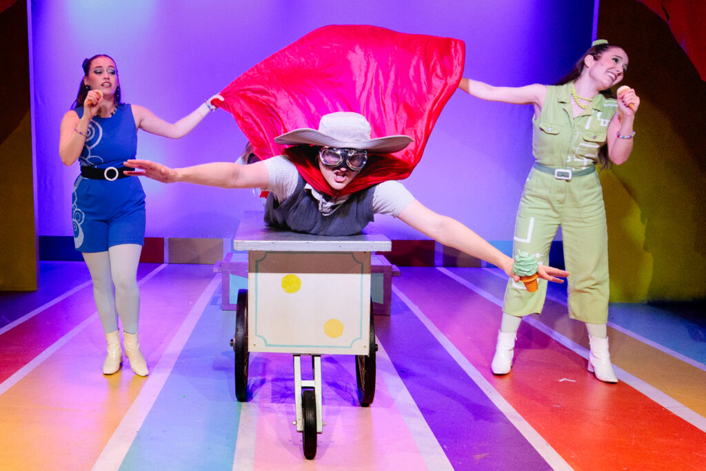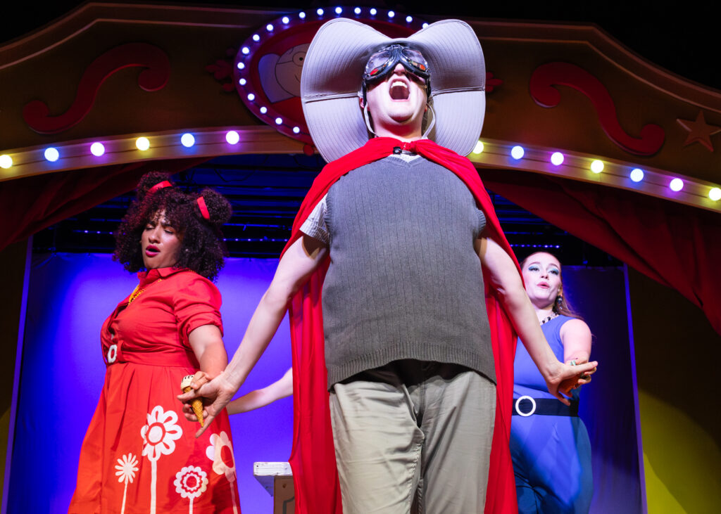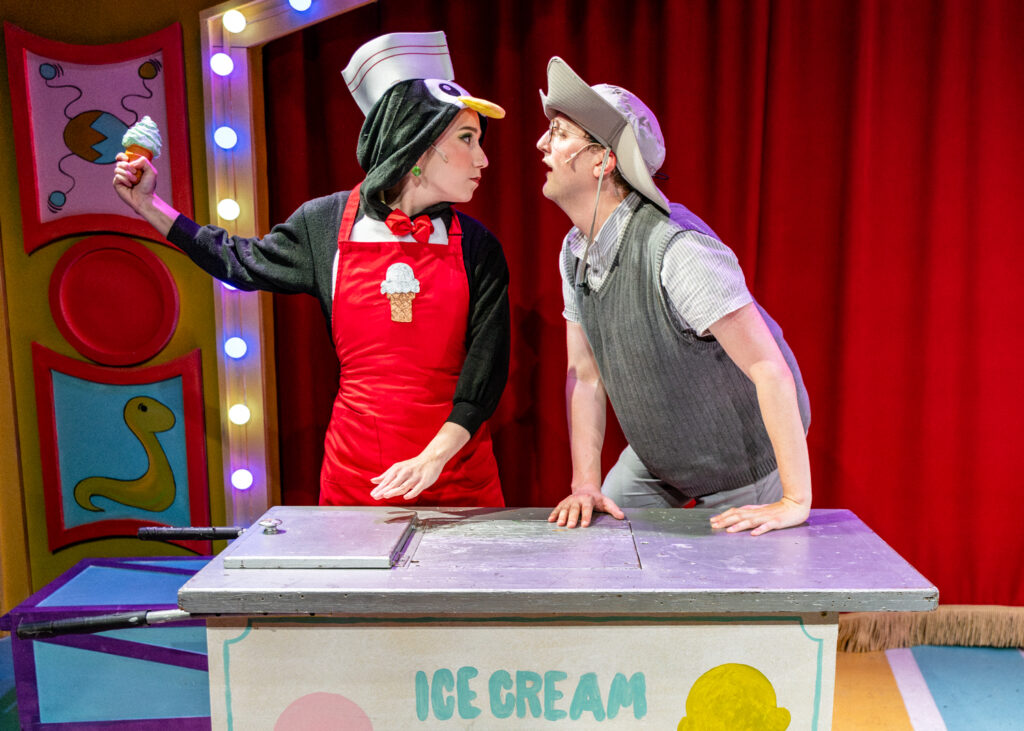 Elephant and Piggie is a popular children’s book series by Mo Willems that began in 2007. Like many of the best children’s series, it shows how characters learn and process emotions, and the play I photographed was very much in this vein. Along with the title characters, Elephant and Piggie, the musical featured a trio of squirrels, a mail delivery dog, and a penguin ice cream vendor (the latter characters portrayed by some of the Squirrelle actors).