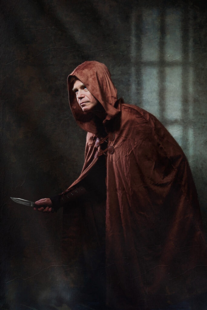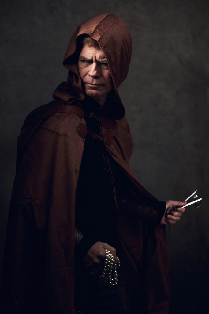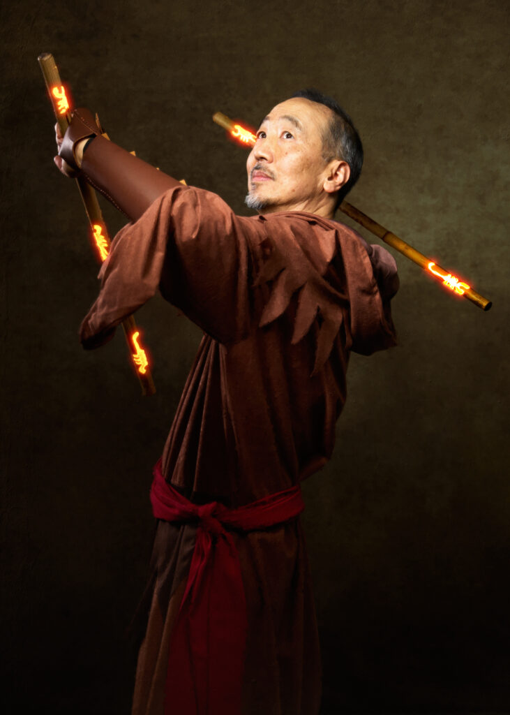 For most of the portraits, I used restricted lights that emphasized shadow. In the behind-the-scenes pictures below, you can see a small strip box with a grid lighting the archer (compare to the final portrait above). The wizard is short-lit with a gridded beauty dish from slightly behind the subject; on the other side of him, a gridded light with an orange gel gives the impression of the firelight we later composited into the scene (see above). The special effects come from stock images, Oniric (the monk’s sticks), and Boris Optics, in the case of the archer and thief.