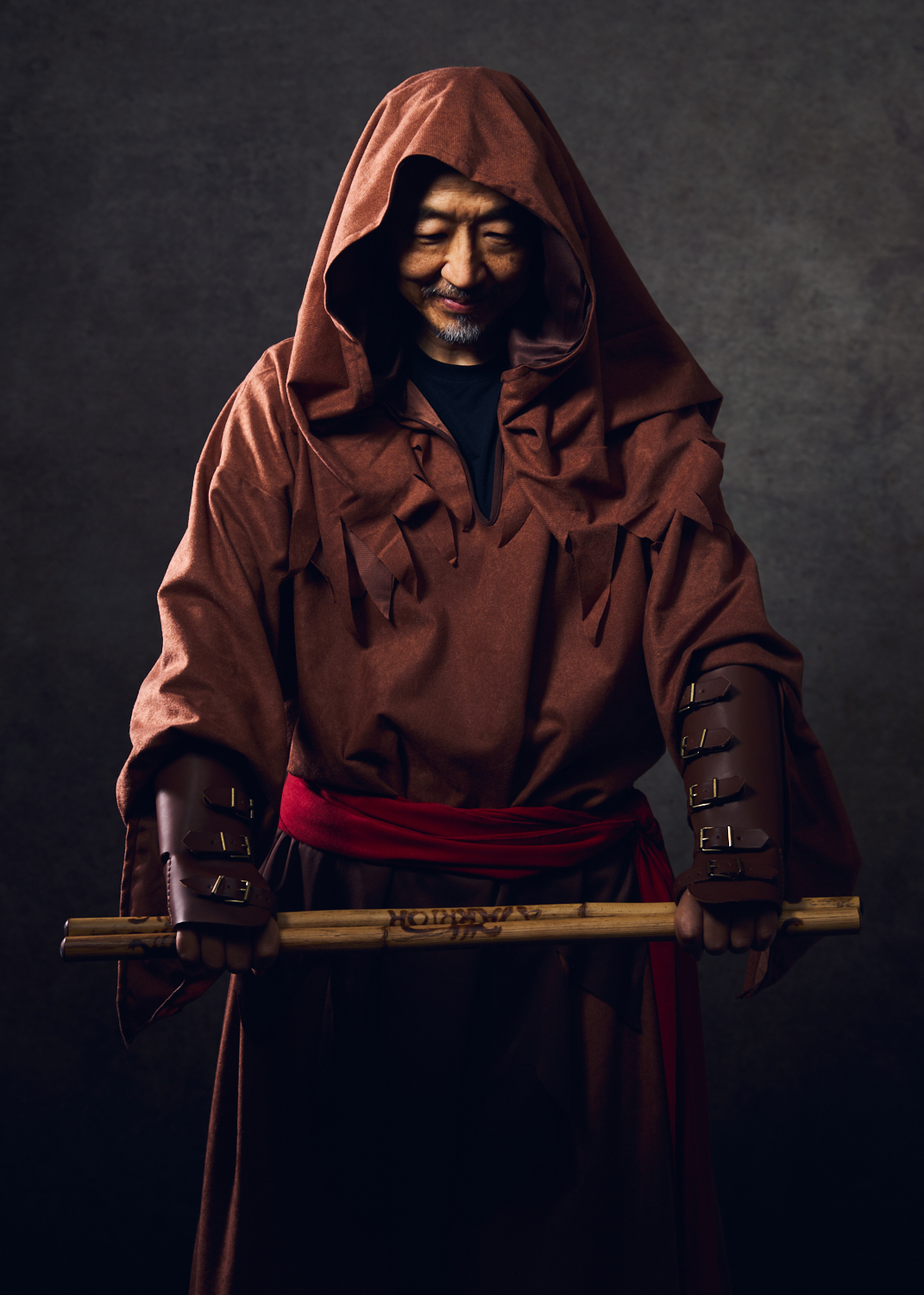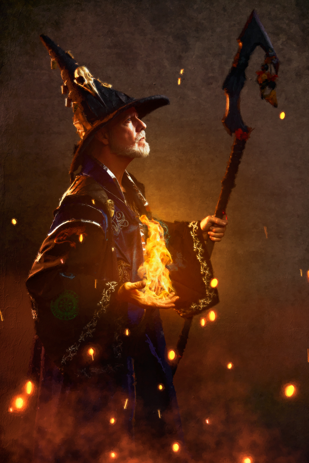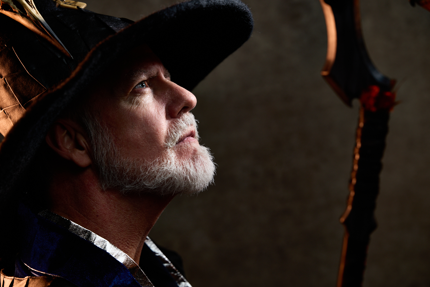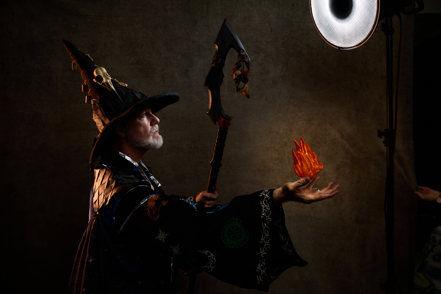 For most of the portraits, I used restricted lights that emphasized shadow. In the behind-the-scenes pictures below, you can see a small strip box with a grid lighting the archer (compare to the final portrait above). The wizard is short-lit with a gridded beauty dish from slightly behind the subject; on the other side of him, a gridded light with an orange gel gives the impression of the firelight we later composited into the scene (see above). The special effects come from stock images, Oniric (the monk’s sticks), and Boris Optics, in the case of the archer and thief.