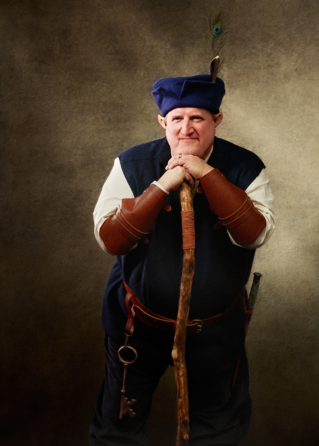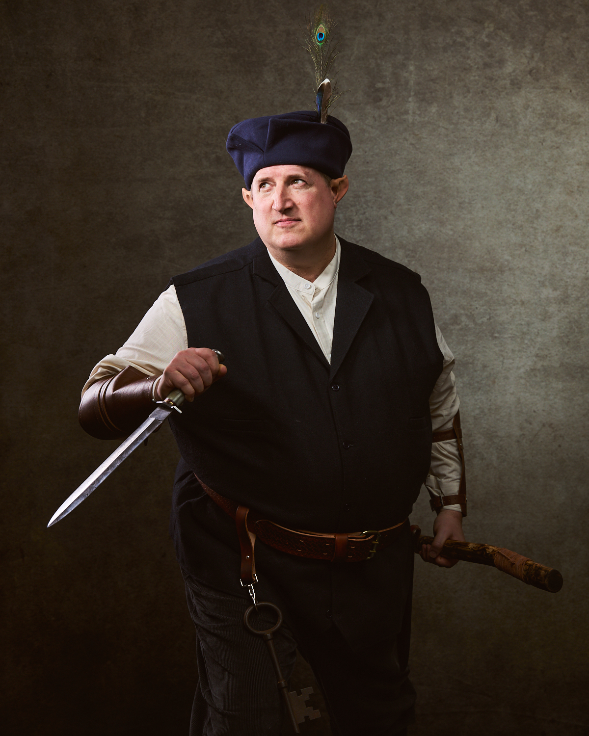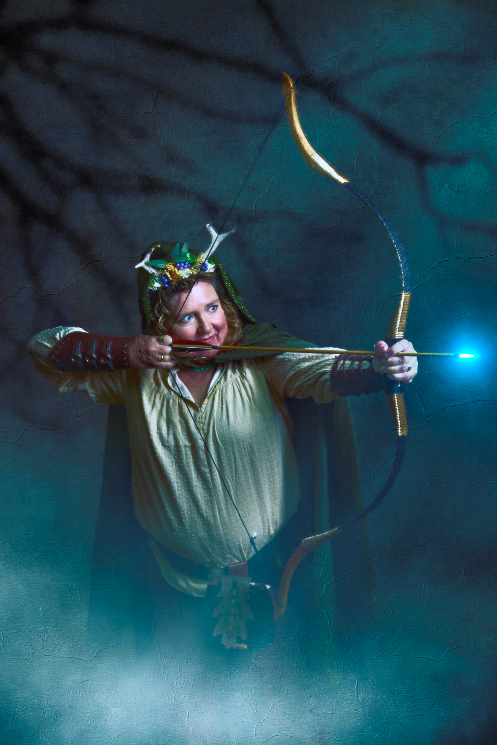 For most of the portraits, I used restricted lights that emphasized shadow. In the behind-the-scenes pictures below, you can see a small strip box with a grid lighting the archer (compare to the final portrait above). The wizard is short-lit with a gridded beauty dish from slightly behind the subject; on the other side of him, a gridded light with an orange gel gives the impression of the firelight we later composited into the scene (see above). The special effects come from stock images, Oniric (the monk’s sticks), and Boris Optics, in the case of the archer and thief.