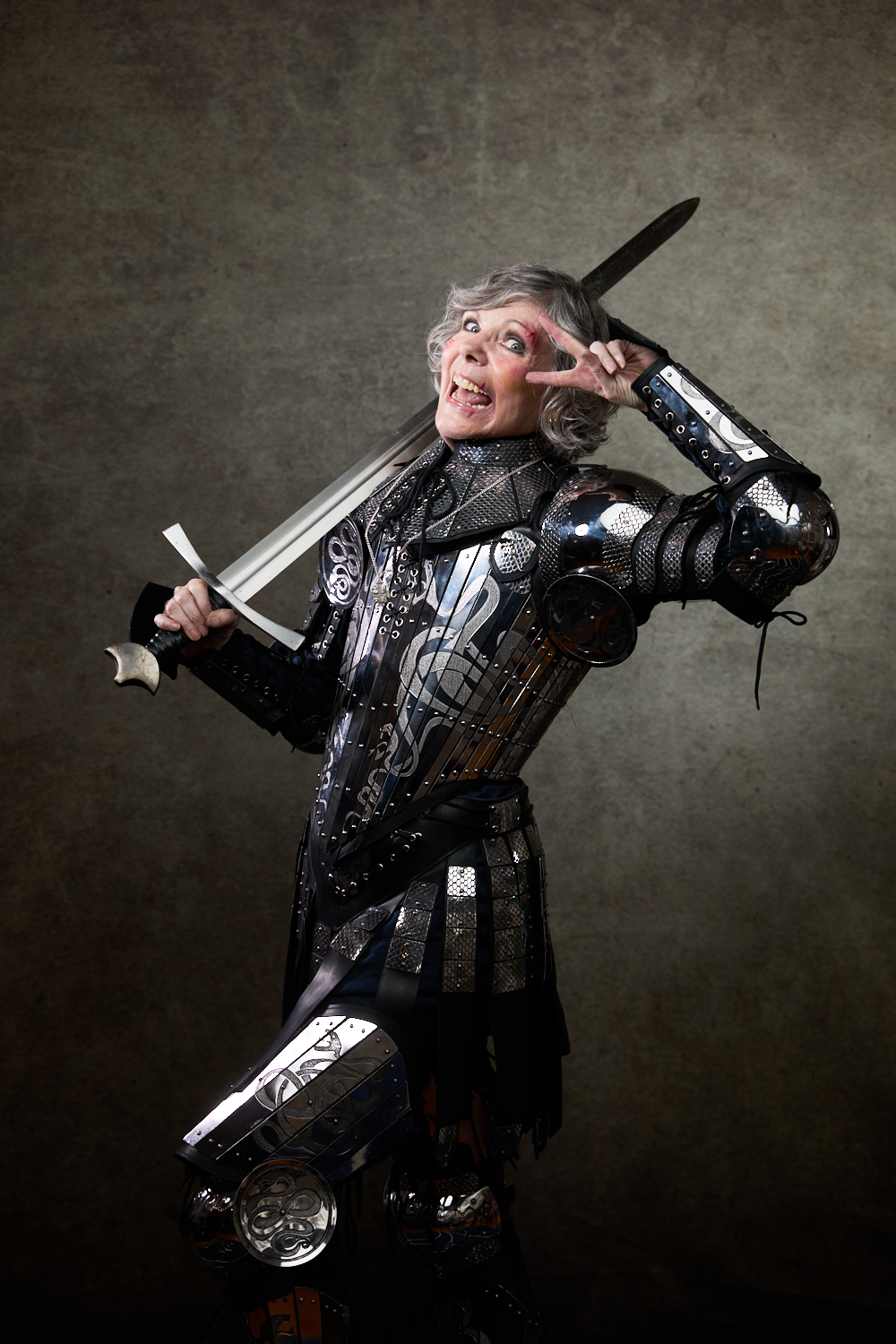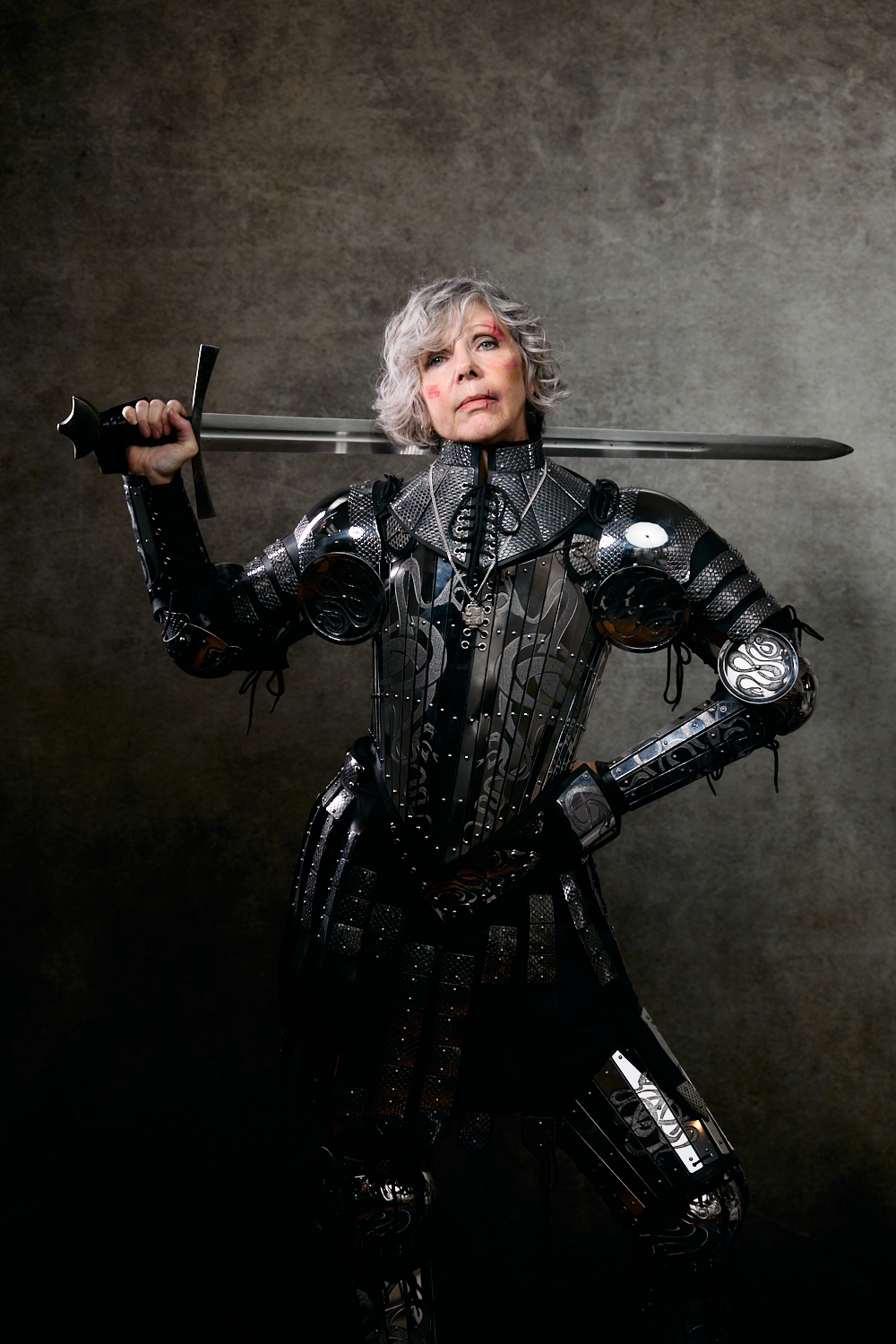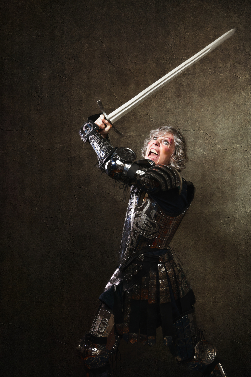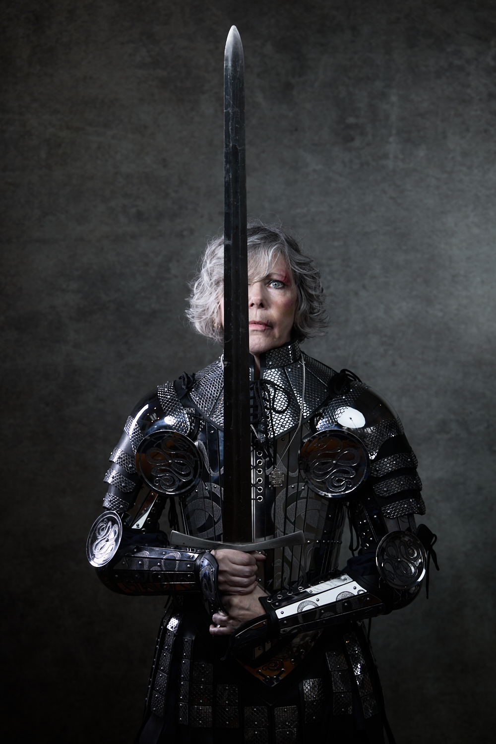 For most of the portraits, I used restricted lights that emphasized shadow. In the behind-the-scenes pictures below, you can see a small strip box with a grid lighting the archer (compare to the final portrait above). The wizard is short-lit with a gridded beauty dish from slightly behind the subject; on the other side of him, a gridded light with an orange gel gives the impression of the firelight we later composited into the scene (see above). The special effects come from stock images, Oniric (the monk’s sticks), and Boris Optics, in the case of the archer and thief.