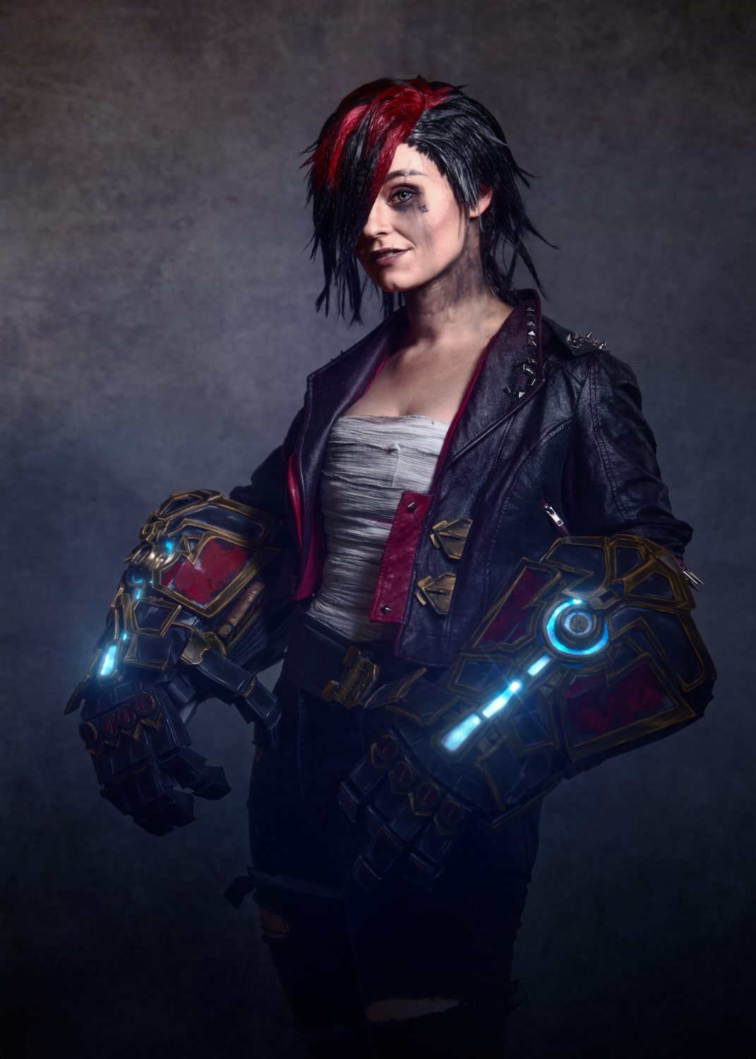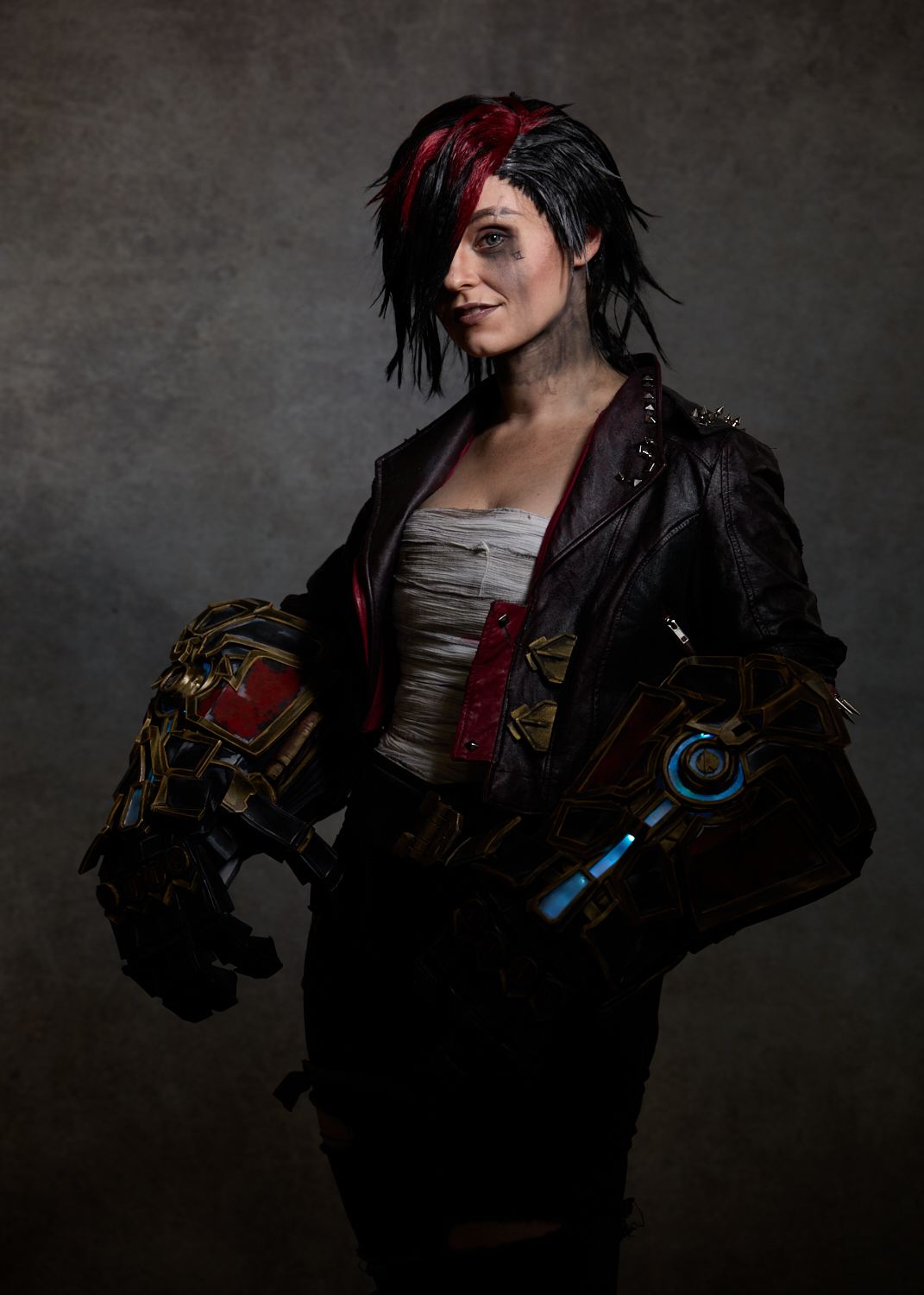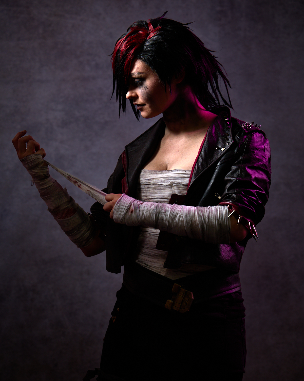 Later, Jess removed the amazing gauntlets she had created, and we finished our session with a more contemplative Vi, wrapping her bandages. By this time, we had covered a variety of looks and moods for Vi, a true collaboration of ideas and experiments that worked to our satisfaction.