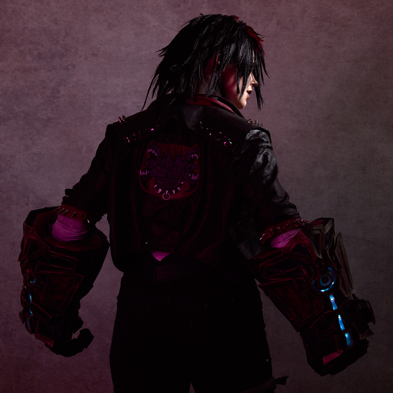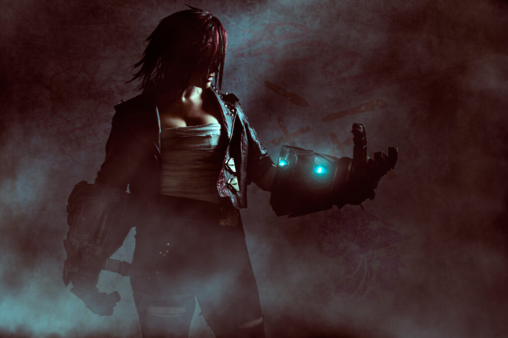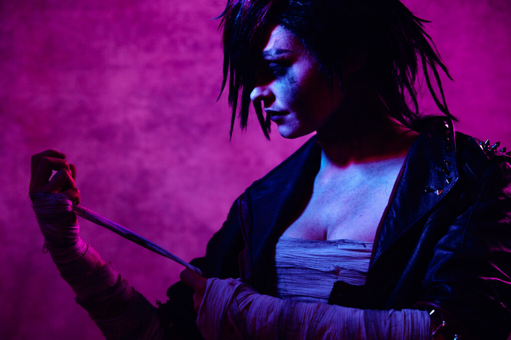 I sometimes spend too much time capturing a great look or moment. However, this time, knowing we had a solid first shot, I moved the session and light along to try something new. I knew the LEDs in Jess’s costume wouldn’t show up if they were lit, so I made sure to keep them in shadow as best I could in every shot we did, moving and flagging the light to achieve this. To emphasize the effect, I moved the light behind her her, giving a dramatic look to the costume, Jess, and Vi. Here’s what that looked like, boosted with hand-drawn haze and glow and some atmospheric graffiti in the background.