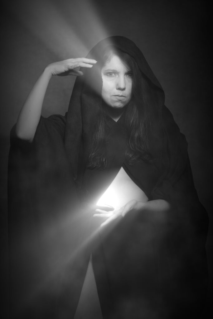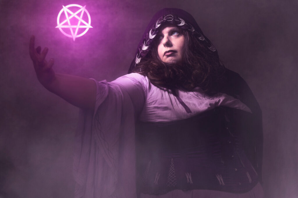 As I began my edits, I explored Boris FX to see what kinds of special effects I could add to these witchy pictures. These were all wildly experimental, and I had fun trying different filters and color grades. As you can see, Laura and Deana had numerous ideas for how to express their characters. I particularly loved the way Laura’s outstretched arm and upward gaze made a perfect place to add a glowing pentacle.