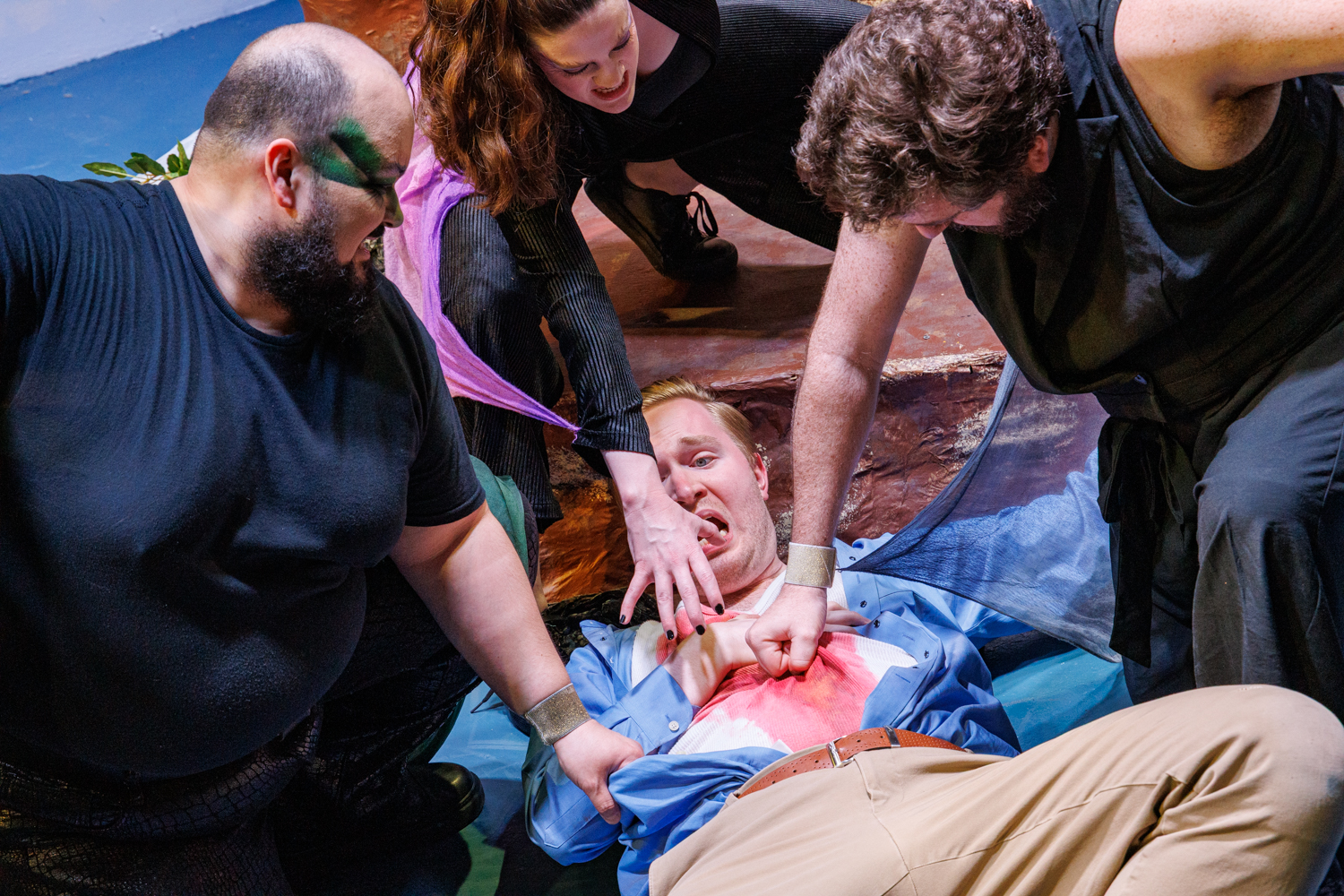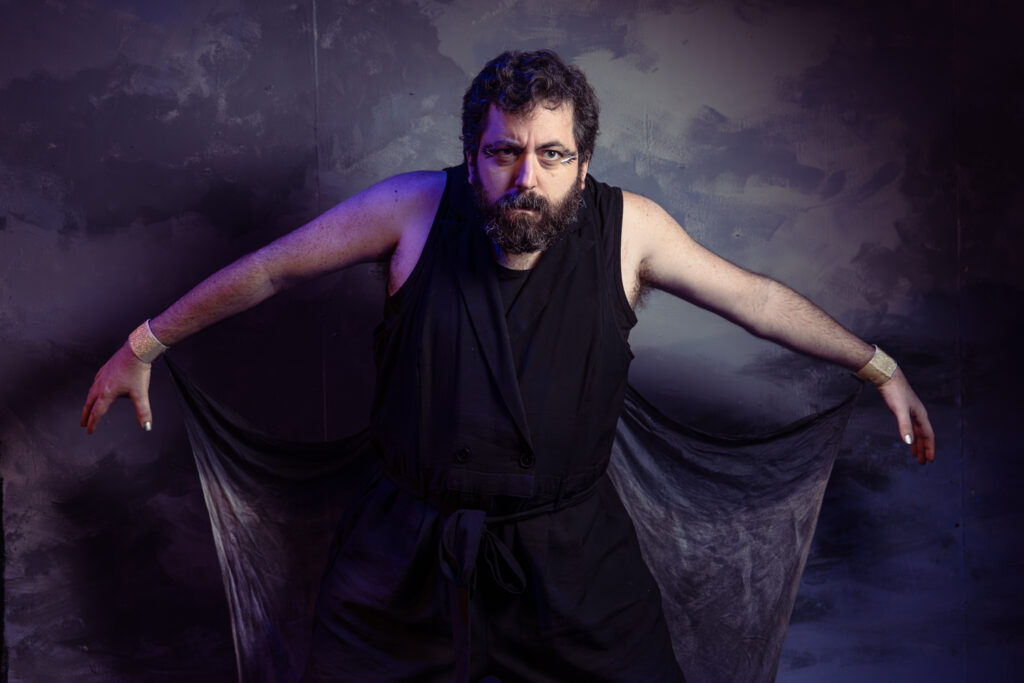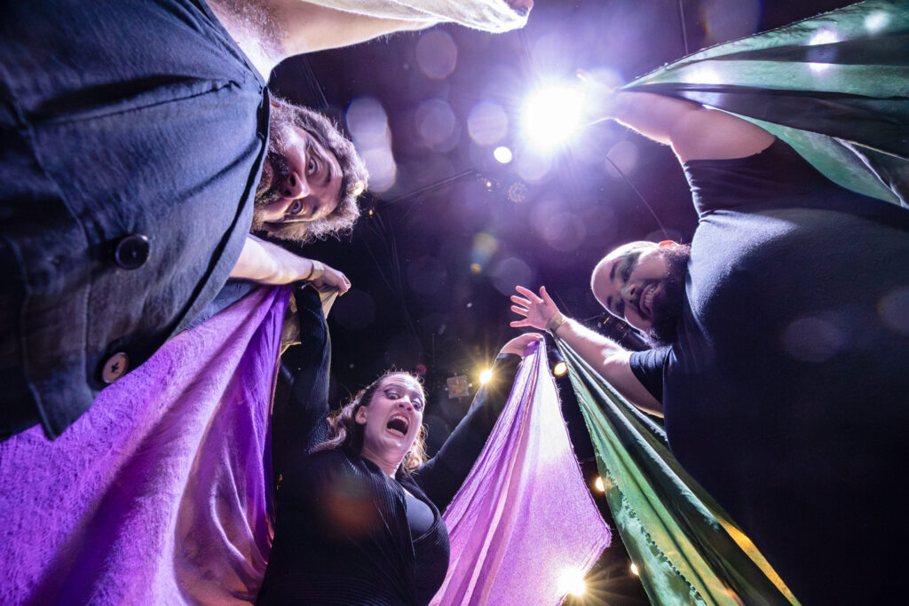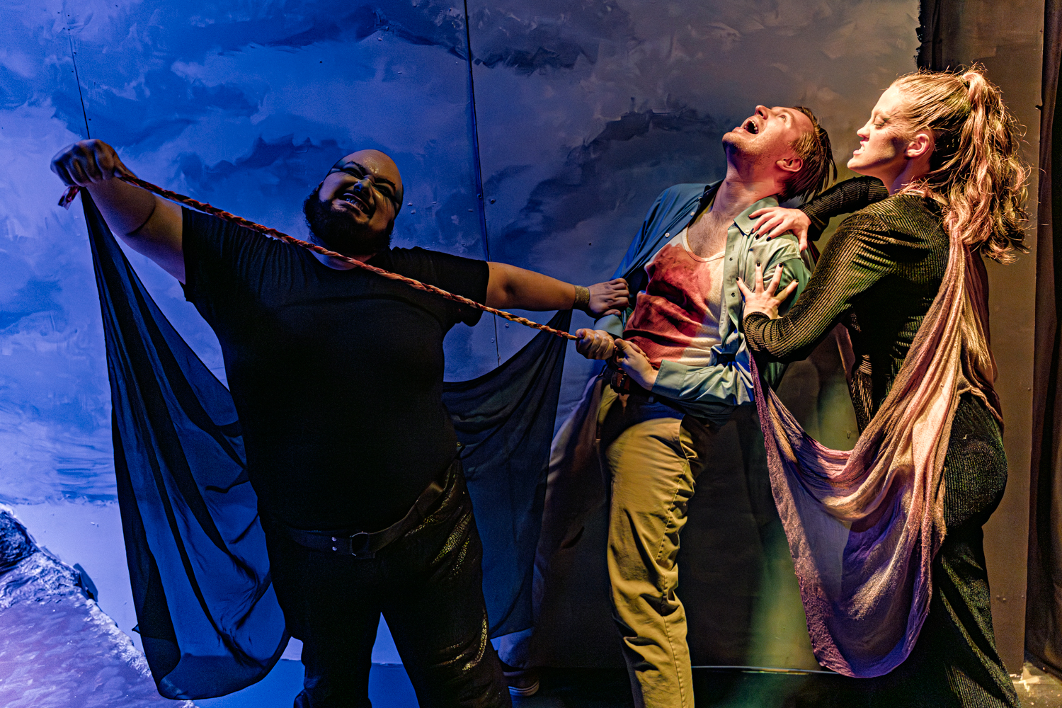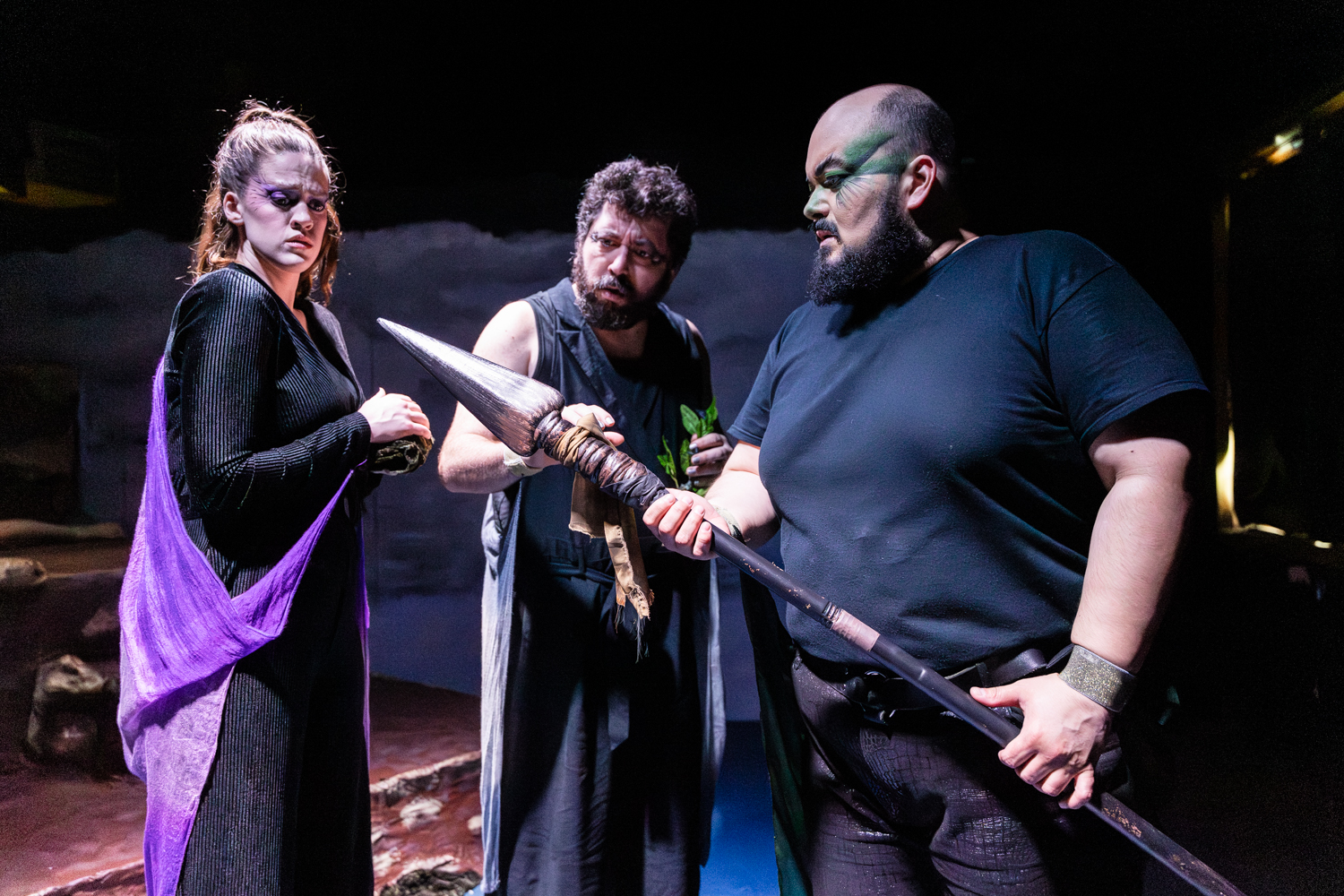 After the portraits, we captured various moments from the show. For these, we moved around and photographed the action from various angles. We also made sure to capture some of the cool projections designed by Annie A, notably the scene where there’s an eclipse onstage. And we got some dynamic shots of the fight and intimacy work choreographed by Bianca Thompson (seen in the digital pages of The All Worlds Traveller in Three of Cups’s Macbeth).