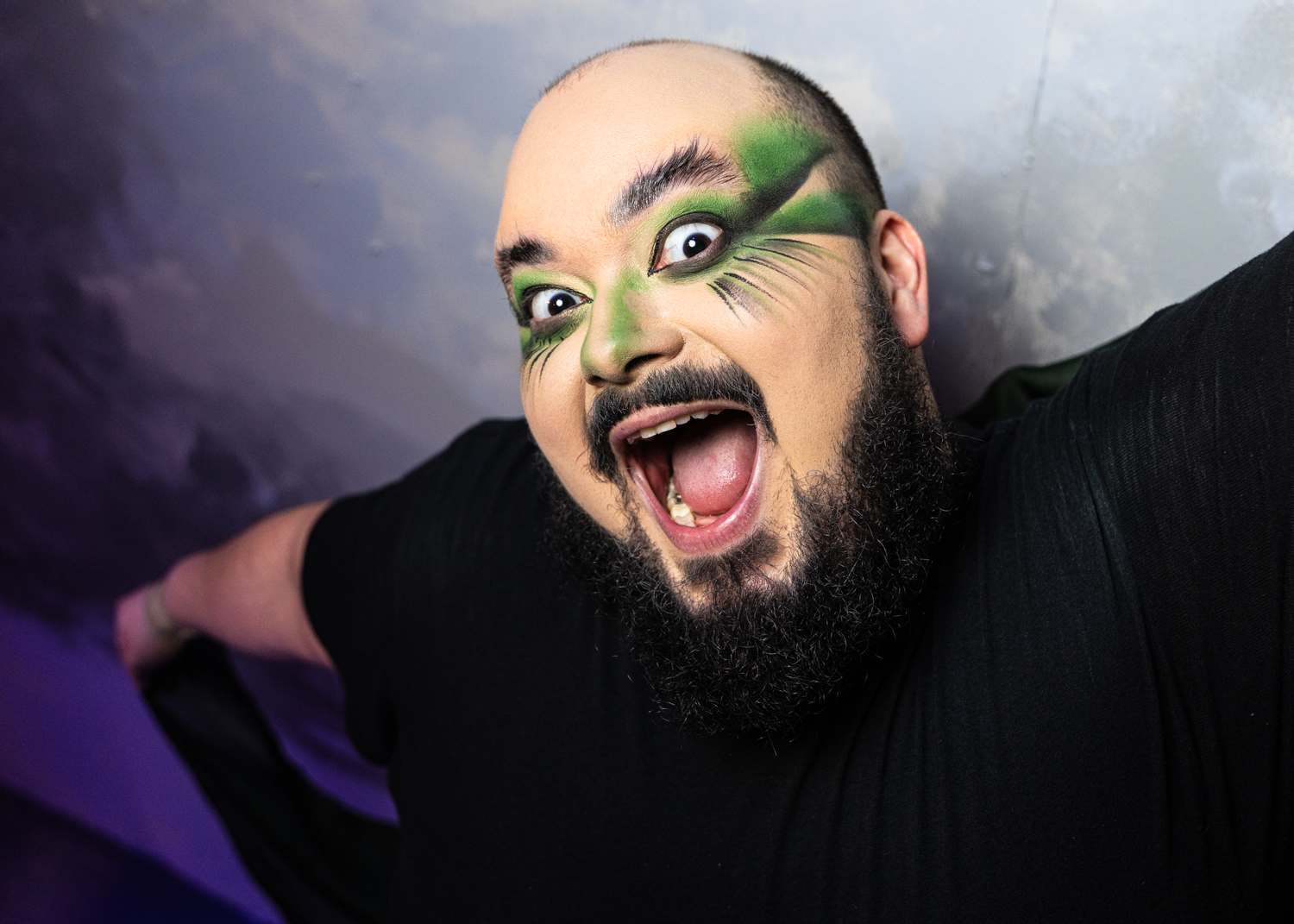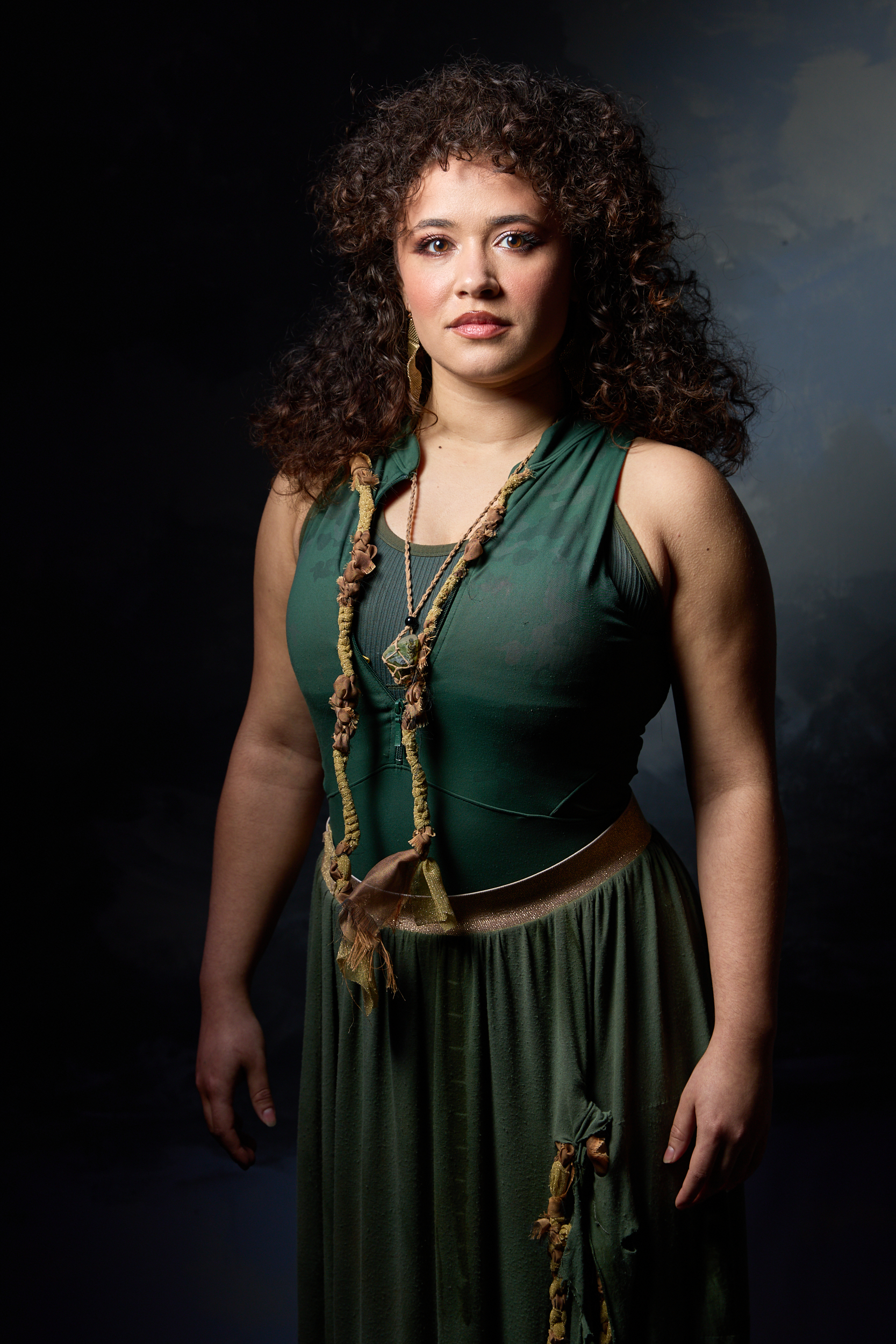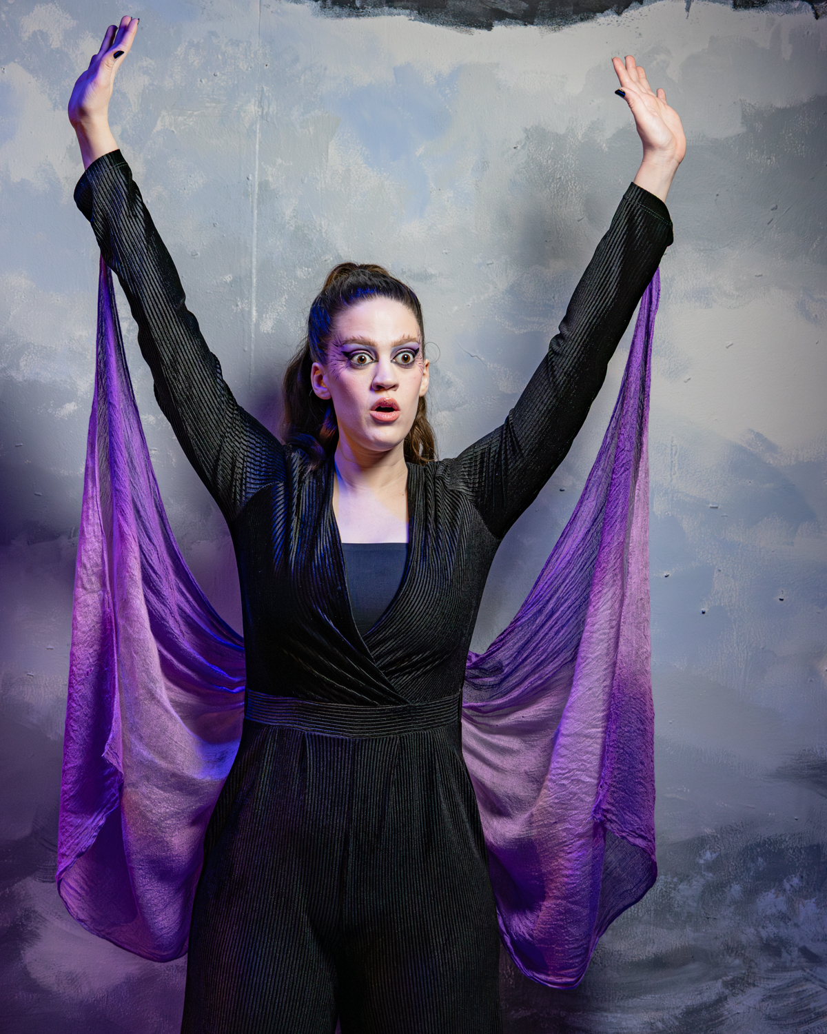 We started with individual portraits of each character. This year, I’ve been challenging myself to travel lighter and shoot more portraits on location, mixing ambient light with flash. With the Kassandra character portraits, I used the beautifully painted background designed by Mary Aurora Moore and painted by Shellie. For most of the portraits, I used a mix of available light and flash, but by the time I got to Kassandra, I restricted the light to only the flash.