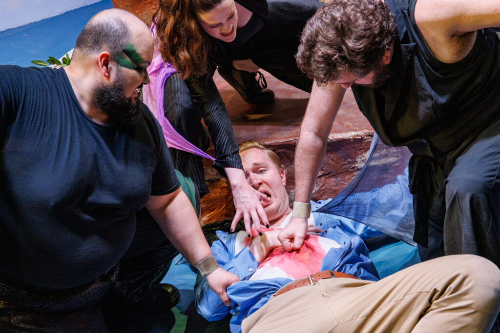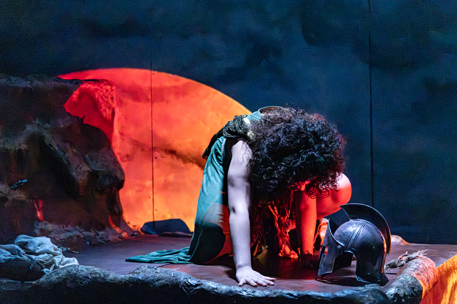 Kassandra at the Top of the World places Troy’s prophet on a rock in the midst of rising waters as she reflects on her life in Troy and her relationship with the gods, occasionally visited by a fourth-wall-breaking trio of comic bird characters, and eventually, Apollo.