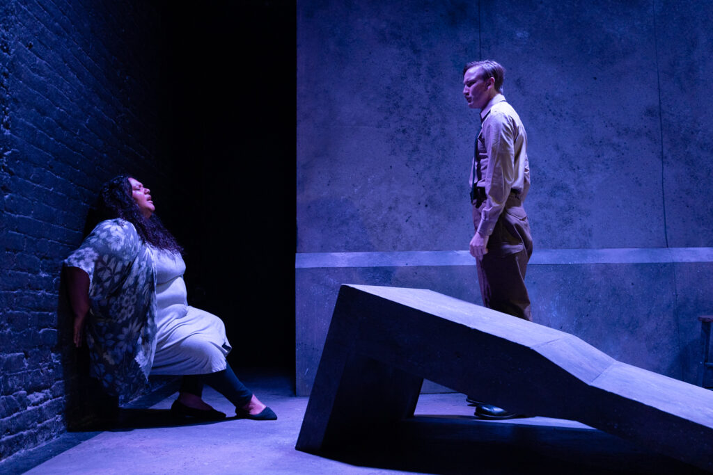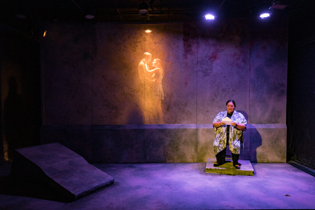 Blank’s production of Passion uses a cool stage-and-lighting effect wherein offstage characters can appear like ghostly visions, almost as though the onstage characters’ thoughts have summoned them. Most of the time, the back wall of the stage is an opaque gray facade. But sometimes, characters suddenly appear through the facade, and behind the speckled texture they appear like living paintings. It was a really neat effect that facilitated the storytelling. And it was fun to photograph.