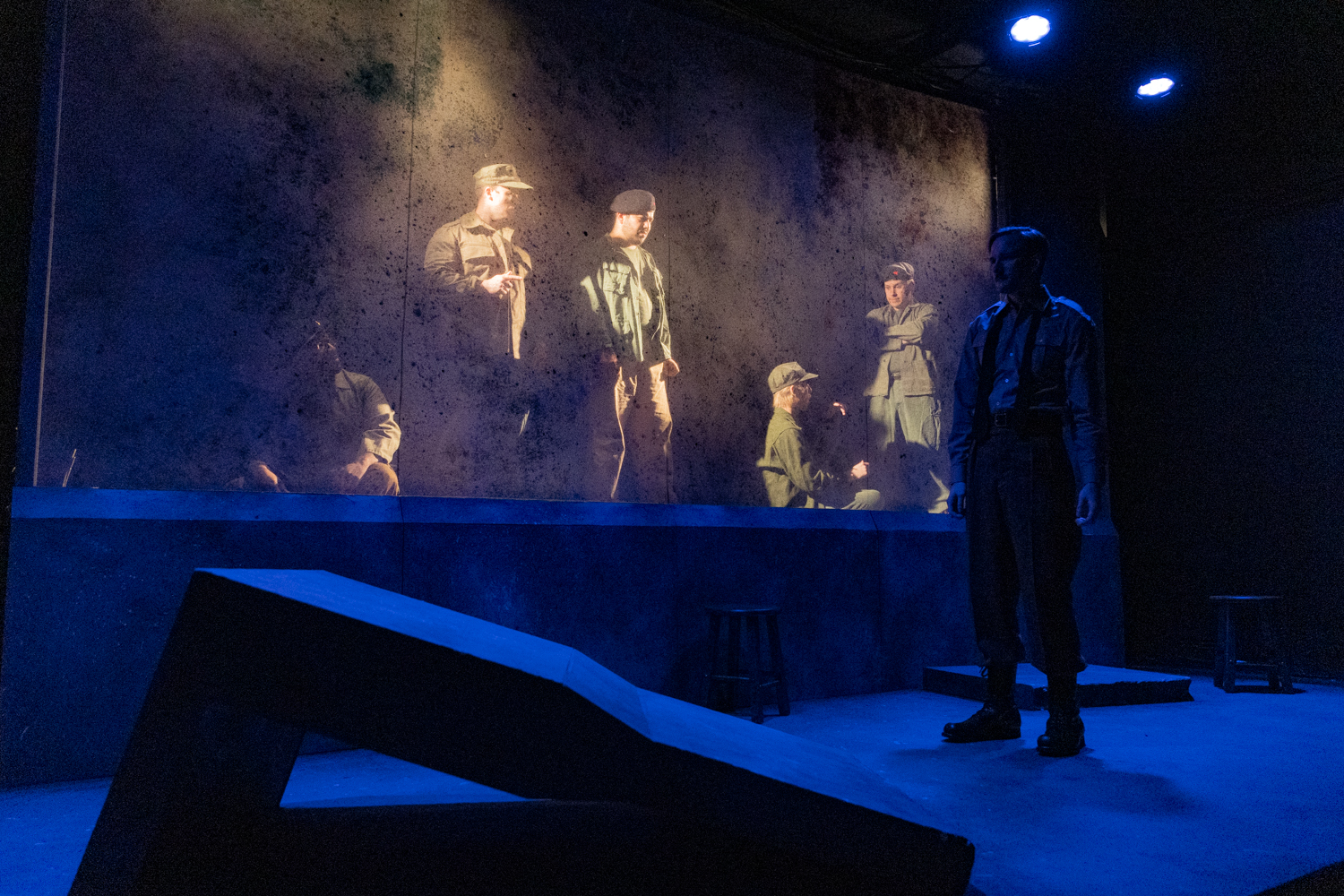 I arrived as early as possible to take a look at the set and lighting and dial in my camera settings, switching over from the previous day’s headshots and portraiture. I learned about the pace of the action from director Danny Kapinos, which helped me estimate the shutter speed I’d need. Scenic designer Haley Wallenfeldt helped me set my camera’s white balance while putting finishing touches on the set. Lighting designer Seojung Jang showed me what to expect throughout the show, especially concerning the very cool “transparent” set effects you’ll see in the photos below. And I got to catch up with costume designer Cindy Moon, whose awesome work is on display in every shot.