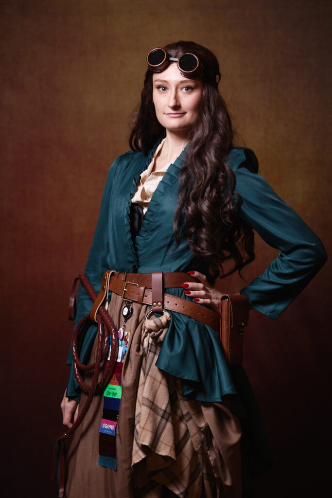 After our rapid-fire portrait session, some participants requested a shot up from the floor below, where they stood in front of the giant stained glass window of the old train station, and we captured this very steampunk portrait.