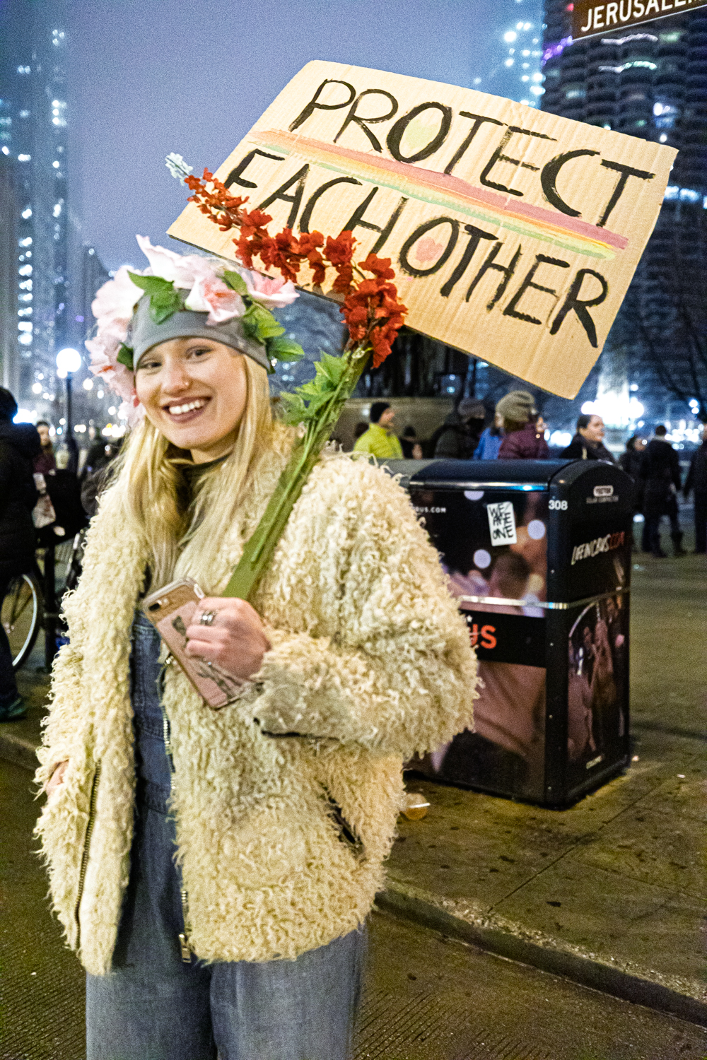 The sun had set, and I was packing my gear, putting camera and lenses away, when I saw a woman standing at a little farther away from everyone else, at the back of the crowd. She carried flowers and wore flowers wrapped around her head. The sign she held bore no militant slogans, catchy graphics, or clever phrases on it. It was a hand-painted sign with a clear message in three words: Protect each other.