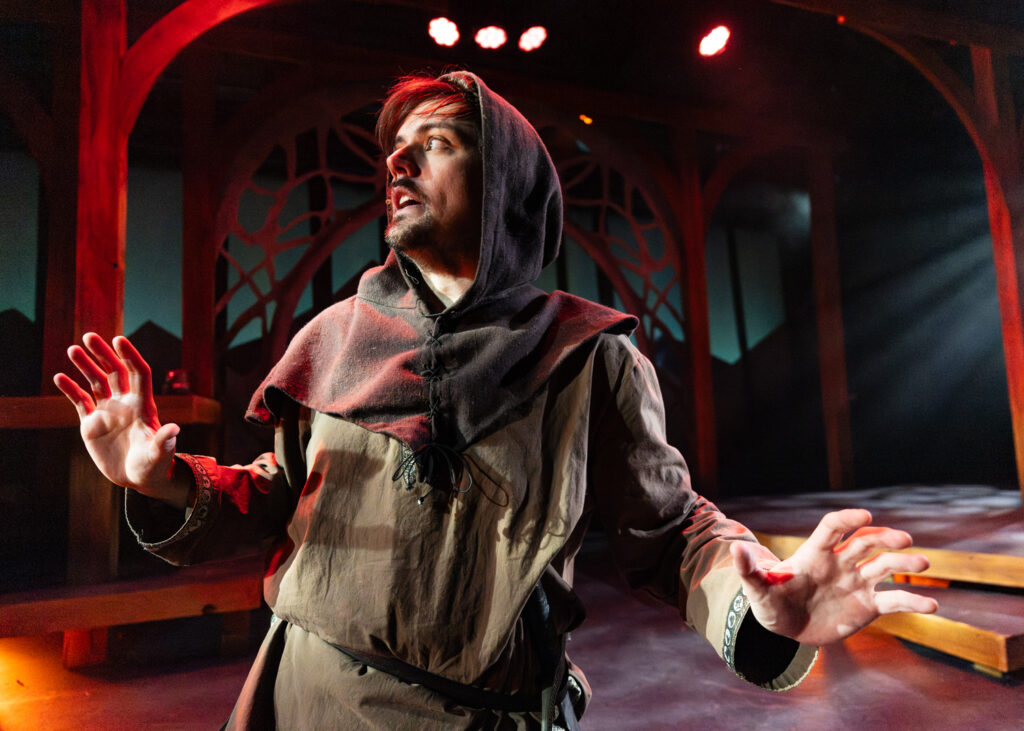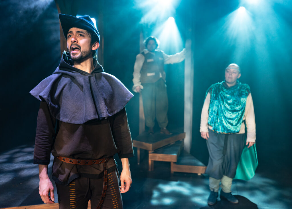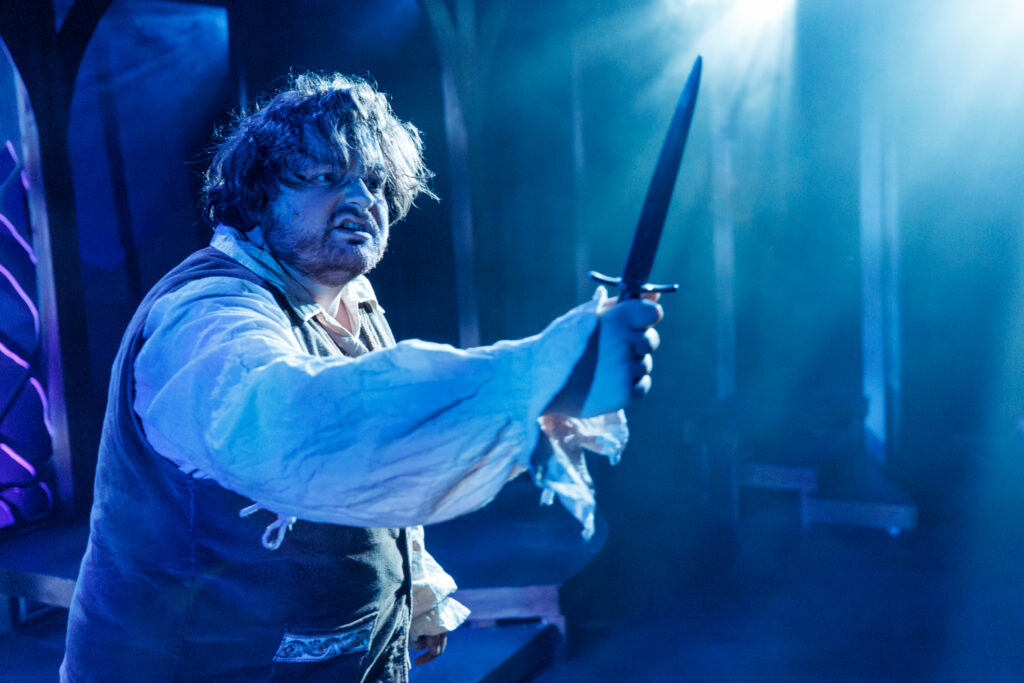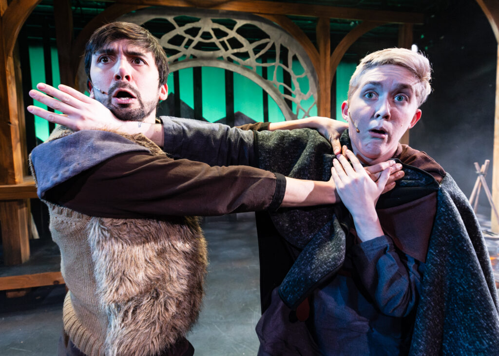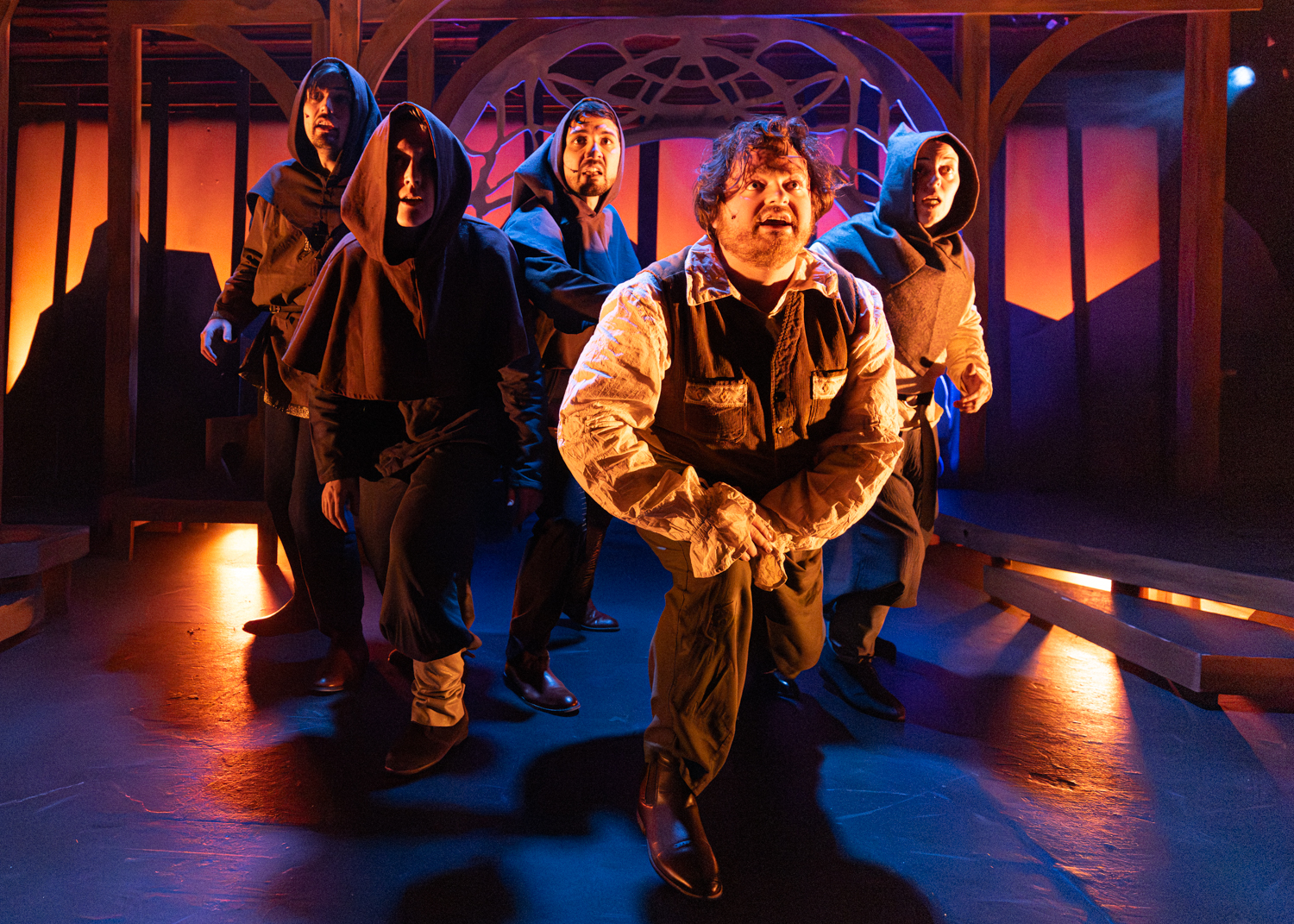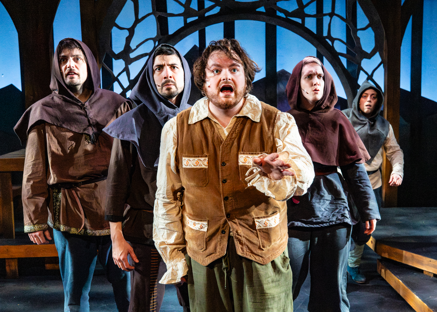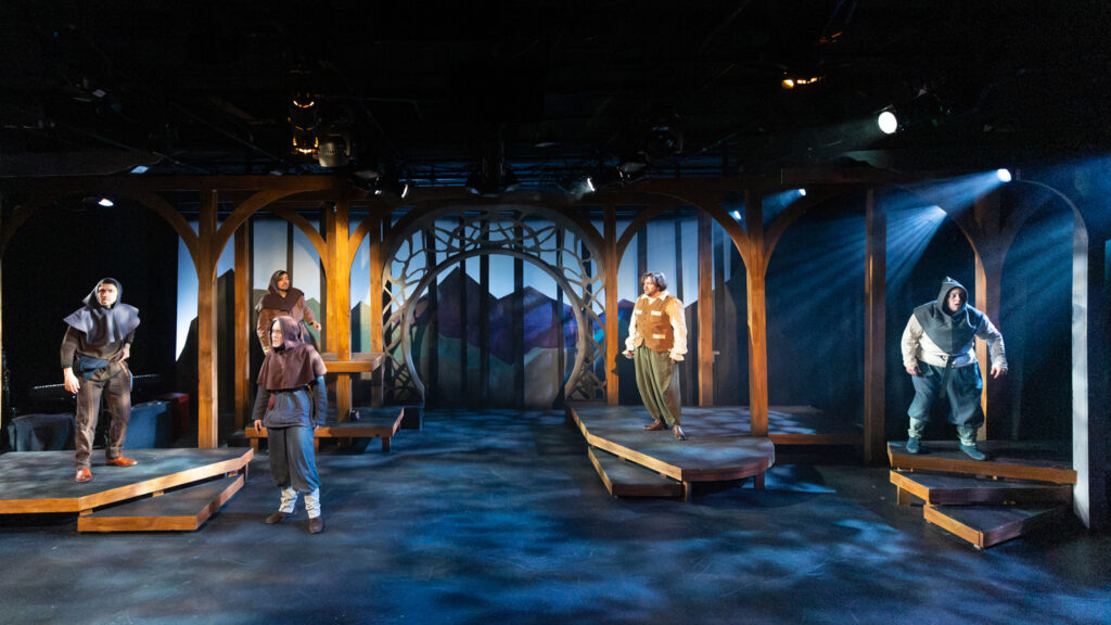 The cast of The Hobbit includes Teddy Gales, Dakota Hughes, Travis Ascione, Alex Benito Rodriguez, and Genevieve Corkery, each pictured below as an assortment of hobbits, wizards, dwarves, elves, humans, and monsters. That’s right: five talented actors embody all the characters in The Hobbit!