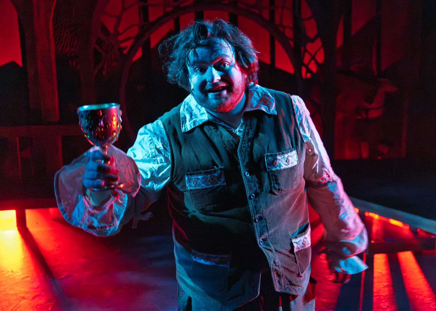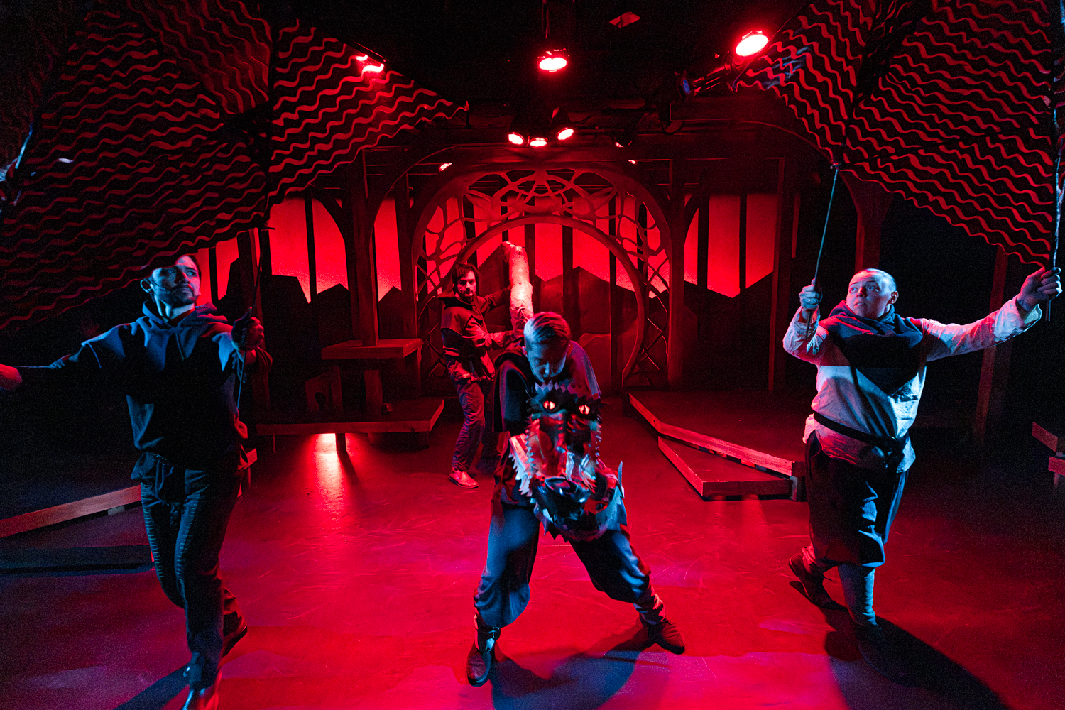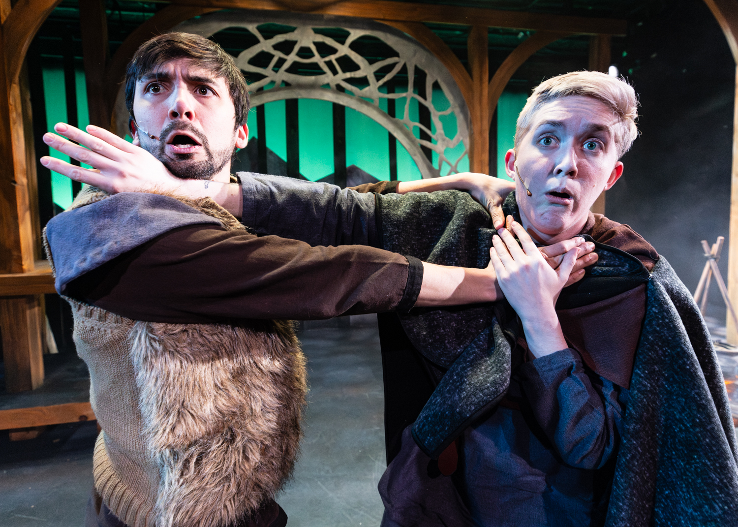 The Hobbit takes place across a wide stage among beautiful scenery, lighting, and set design. Before the run, I conferred with artistic director Randy White and lighting designer Bridget Williams about lens choice for my primary camera. I wanted to gather some information about the staging of the play in order to decide whether to shoot primarily wide or primarily close. Given the breadth of the stage and possible zones of action in the play, we decided to go primarily wide, and I’d zoom in and out with my legs—which almost got me trampled by goblins, but I know adventurers who have suffered worse fates while adventuring.
