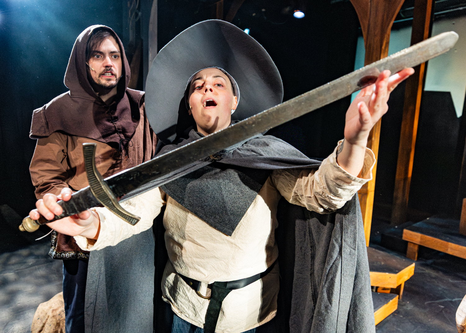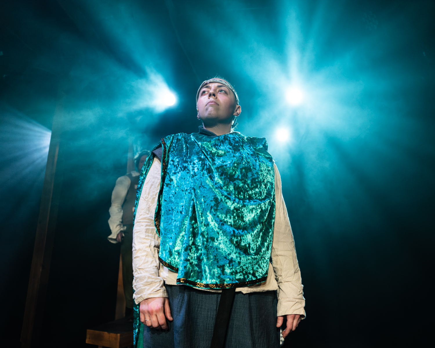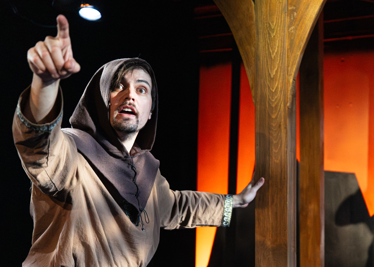 The Hobbit takes place across a wide stage among beautiful scenery, lighting, and set design. Before the run, I conferred with artistic director Randy White and lighting designer Bridget Williams about lens choice for my primary camera. I wanted to gather some information about the staging of the play in order to decide whether to shoot primarily wide or primarily close. Given the breadth of the stage and possible zones of action in the play, we decided to go primarily wide, and I’d zoom in and out with my legs—which almost got me trampled by goblins, but I know adventurers who have suffered worse fates while adventuring.